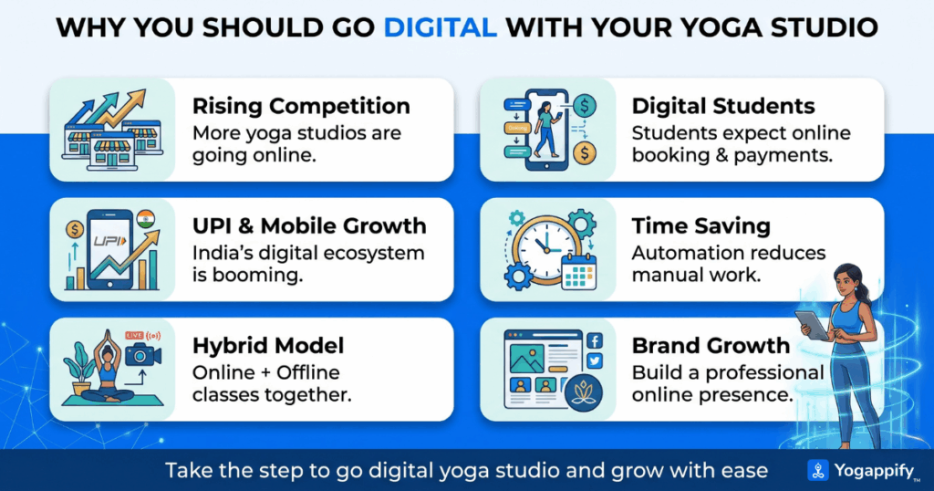 Discover why today’s digital shift in India makes this the perfect time for yoga studios to go digital yoga studio online with Yogappify, grow faster, work smarter, and stay ahead.